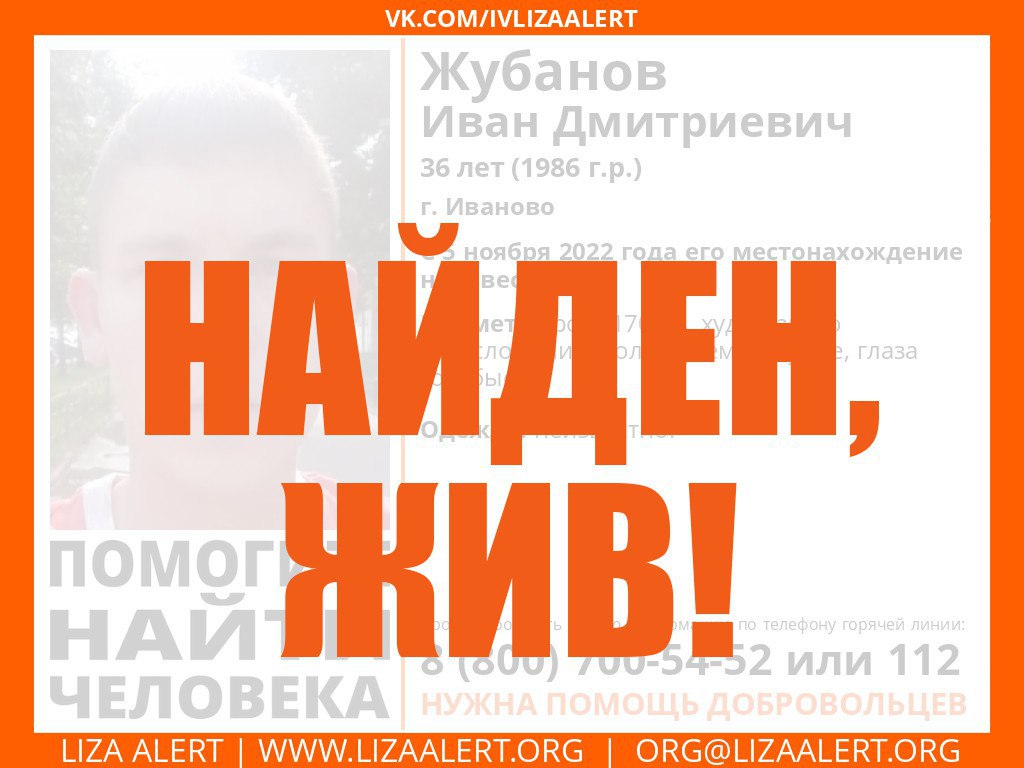 Ранее мы сообщали о поисках 36-летнего ивановца. Александра Жубанова ищут с 5 ноября. А вскоре отряд «ЛизаАлерт» на своей странице в соцсетях сообщил хорошие новости. Выяснилось, что Александр найден и жив.
