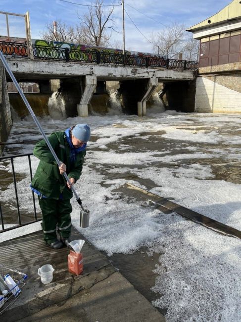 Однако специалисты департамента все равно провели обследование водоема на биологическое и химическое загрязнение водоема и взяли пробу с его поверхности так как количество устойчивой пены довольно большое.