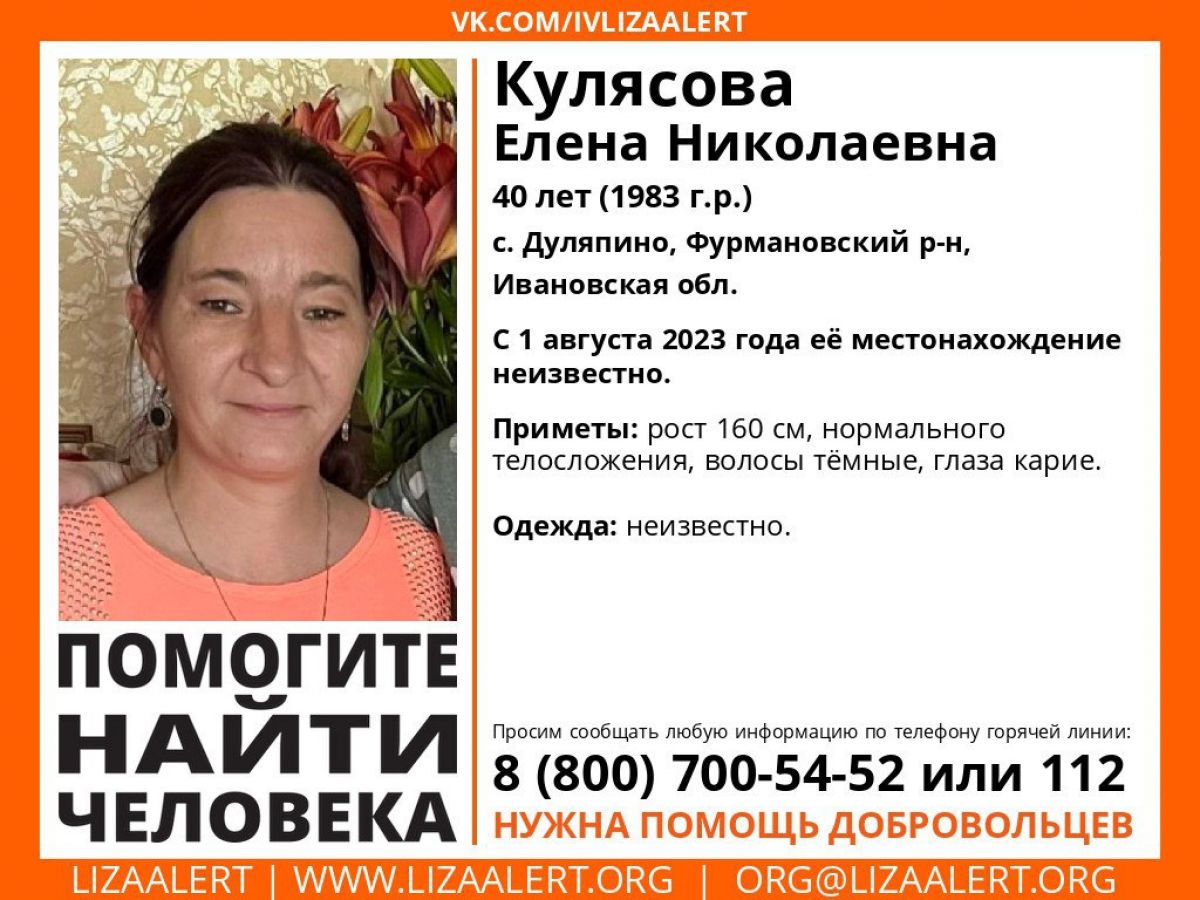В Ивановской области пропала 40-летняя женщина. Речь идет о Надежде Кулясовой, проживающей в селе Дуляпино Фурмановского района.