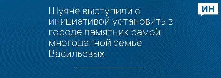 В ходе встречи с главой Шуи Натальей Корягиной инициативная группа жителей выступила с предложением установить в городе памятник самой многодетной семье Васильевых. Для этого и повод есть подходящий - 2024-й год является Годом семьи. Все обращения будут проработаны более детально, говорится на сайте Шуйской мэрии.