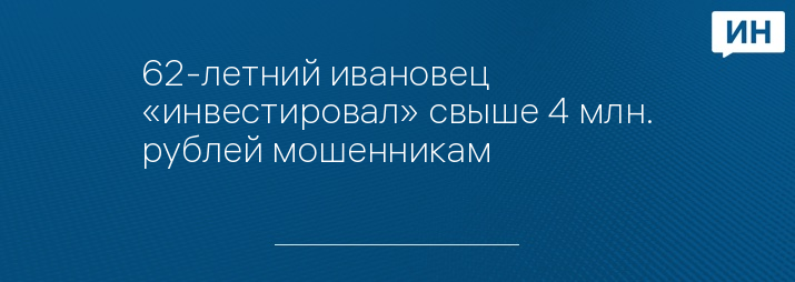 «Зарабатывал» ивановец, ничего не подозревая, 10 дней. За это время он успел перевести на неизвестный счет свыше четырёх миллионов рублей. Как только понял, кто зарабатывает на самом деле, позвонил в полицию. Возбуждено уголовное дело по части 4 статьи 159 УК РФ (мошенничество).