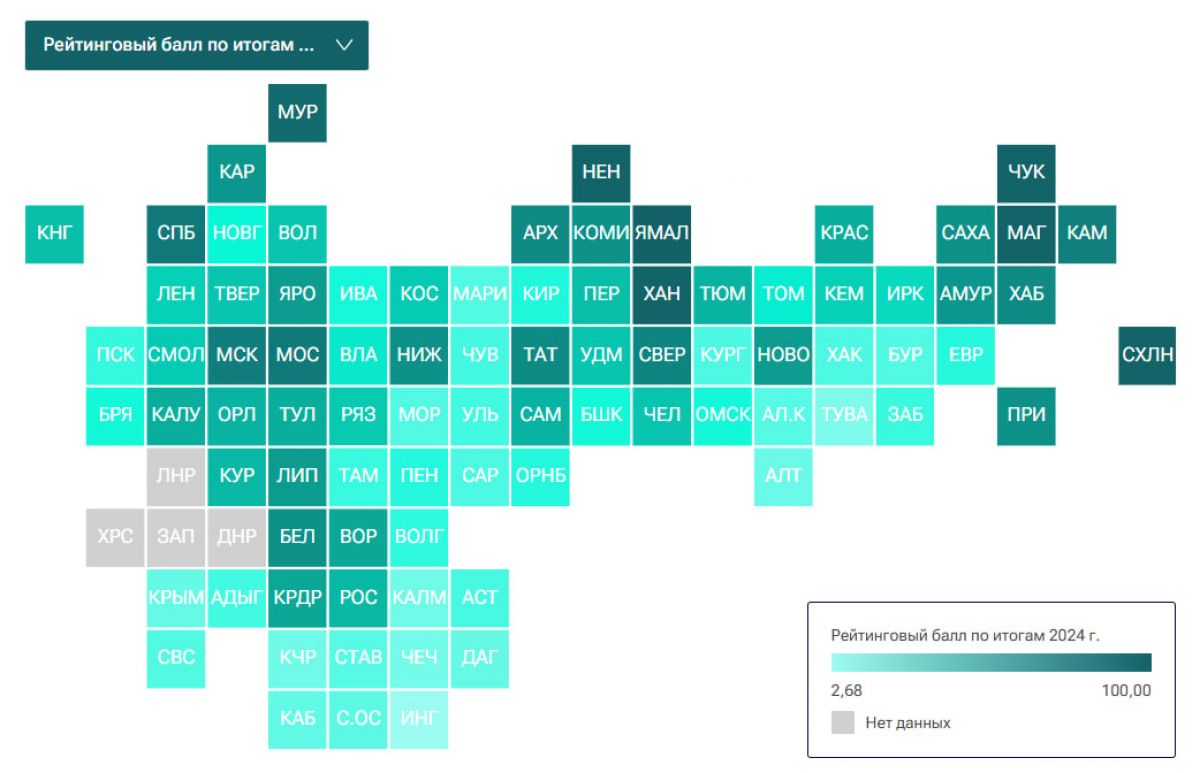 Лидерами рейтинга стали северные регионы: ЯНАО (показатель 100), ХМАО (показатель 99,31), Магаданская область (показатель 99,11). В хвосте оказались южные республики: Чеченская республика (показатель 21,73), Республика Тыва (показатель 16,02), Республика Ингушетия (показатели 2,68).