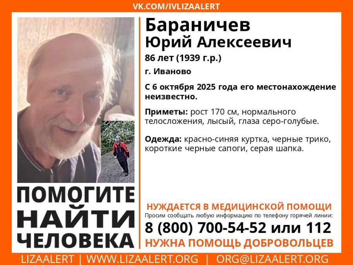 В Иванове разыскивается пожилой мужчина. Зовут его Юрий Бараничев, ему полных 86 лет. Как стало известно, с 6 октября он перестал выходить на связь, и его местонахождение не выяснено до сих пор. Областной поисковый отряд "ЛизаАлерт" в тот же день объявил о начале поисков.