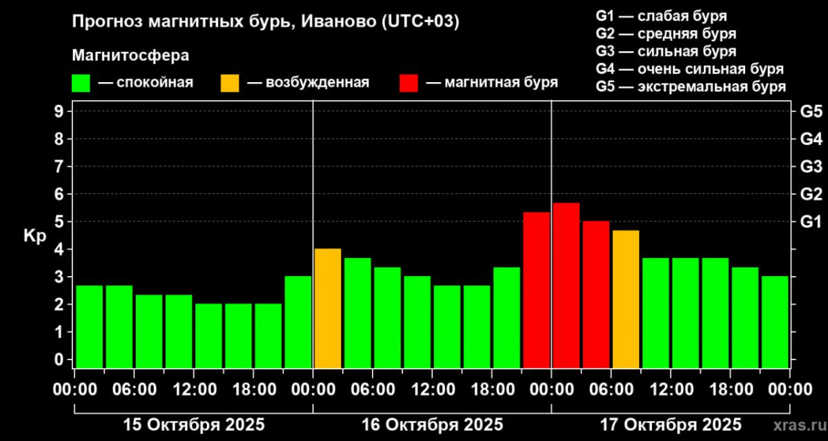 Отсюда и прогноз Лаборатории солнечной астрономии ИКИ и ИСЗФ, который гласит о грядущих магнитных бурях в нашем регионе. Слабая буря уровня G1 ожидается с 21:00 16 октября до 6:00 17 октября. Кроме того, вероятность наступления магнитной бури уже сегодня, 15 октября, составляет 26%.