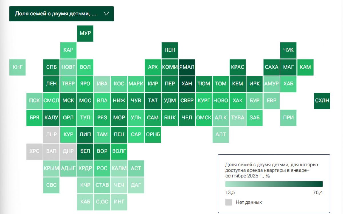 При исследовании учитывались данные из официальной статистики. Доступность аренды определяется процентом семей, способных снимать стандартную «двушку». При этом предполагается, что в каждой семье есть двое взрослых и двое детей. 70% средств, оставшихся после вычета прожиточного минимума из семейного бюджета, семья направляет на аренду жилья, а 30% – на другие расходы. Доля семей, которые могут позволить себе оплату аренды и повседневные траты, вычисляется на основе анализа распределения заработных плат среди работающих в регионе. Арендные ставки учитываются за период с января по сентябрь текущего года, а прожиточные минимумы устанавливаются для каждого субъекта федерации отдельно за 2025 год соответственно.