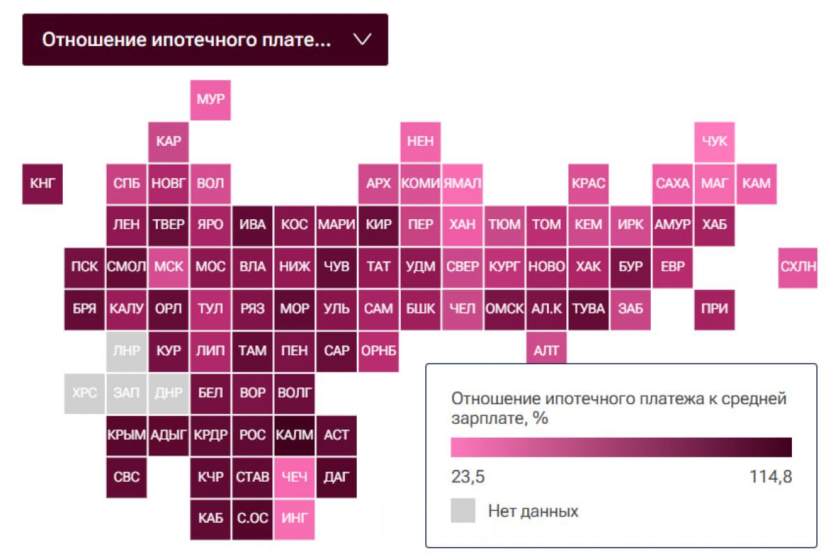 Лидерами рейтинга стали Чукотка, ЯНАО, Ингушетия. Именно в этих регионах отношение ипотеки к зарплате не превышает 28,4%, сумма ипотечного платежа – не более 84,2 тысячи рублей при сумме кредита не более 4,8 млн рублей.