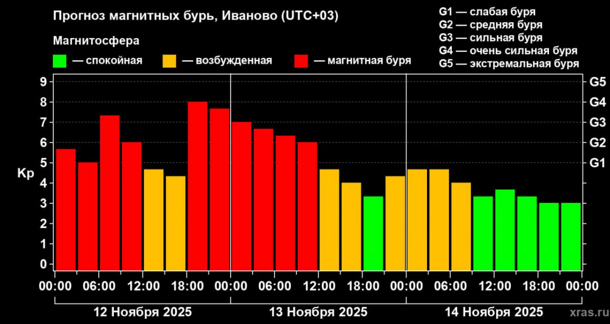 Именно 12 и 13 ноября в Иванове уровни магнитных бурь будут колебаться от G1 до G4 с показателями Кр от 5 до 8 (максимум 9). Мощнейший выброс будет наблюдаться с 18:00 до полуночи 13 ноября. Дальше буря пойдет на спад.