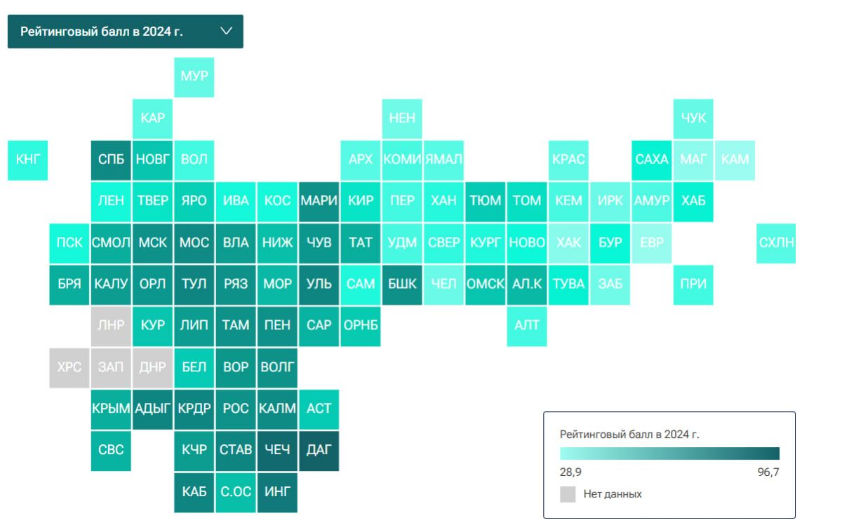 Лидерами рейтинга стали южные регионы – Дагестан, Чечня, Ингушетия. За 2024 год их рейтинговый балл был не ниже 86,9, стремясь к 100. При том Республика Дагестан и Чеченская республика второй год занимают соответствующие позиции. В «хвосте» оказались Камчатский край (85 место, показатель за 2024 год 28,9; место в 2023 году 84), Еврейская автономная область (84 место, показатель 29,8; в 2023 году 85 место) и Магаданская область (83 место, показатель 33,3; соответствующее место в 2023 году).