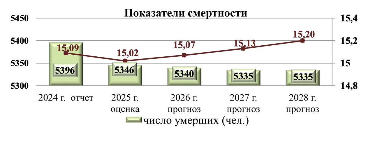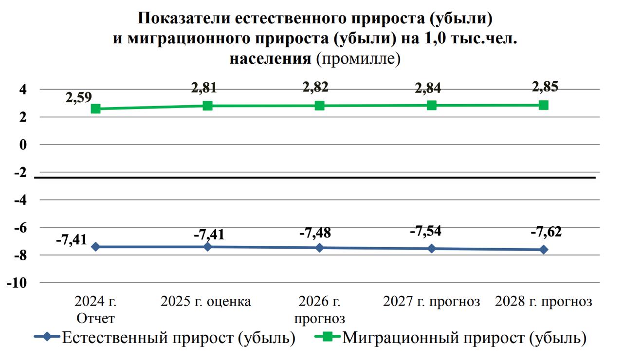 Прогнозируется сохранение естественной убыли населения. Коэффициент рождаемости снизится с 7,61% в 2025 году до 7,58% в 2028 году.