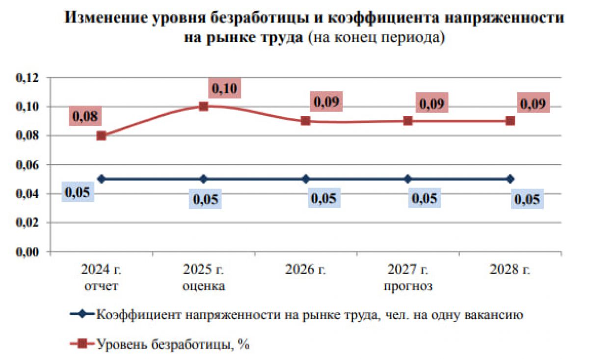 Прогноз на текущий год предусматривает рост среднемесячной заработной платы до 59313,1 рублей (115% к 2024 году), увеличение фонда заработной платы до 100,36 миллиардов рублей и сохранение уровня безработицы на отметке около 0,10%. В текущем году численность безработных ожидается на уровне 205 человек, коэффициент напряженности – 0,05.