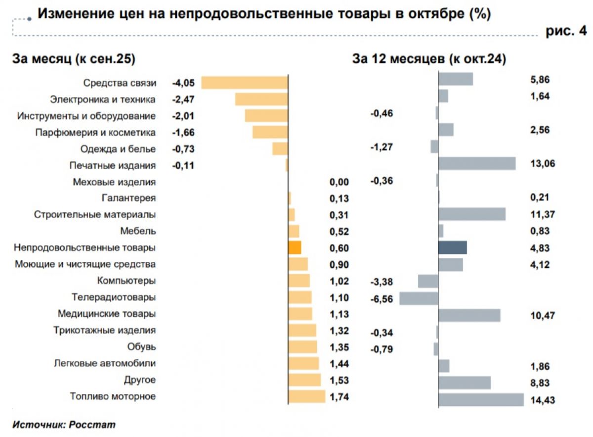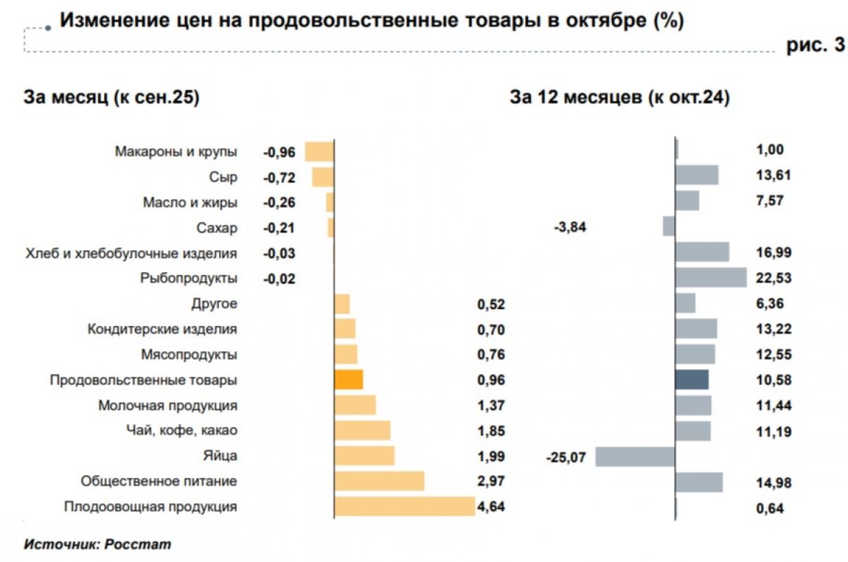 Эксперты обращают внимание на данные с исключением сезонного фактора: в октябре темпы роста цен ускорились по сравнению с предыдущим месяцем. Ключевой причиной стала динамика на рынке плодоовощной продукции. После сезонного снижения стоимости в сентябре овощи и фрукты вновь резко подорожали, что и задало общий тренд.