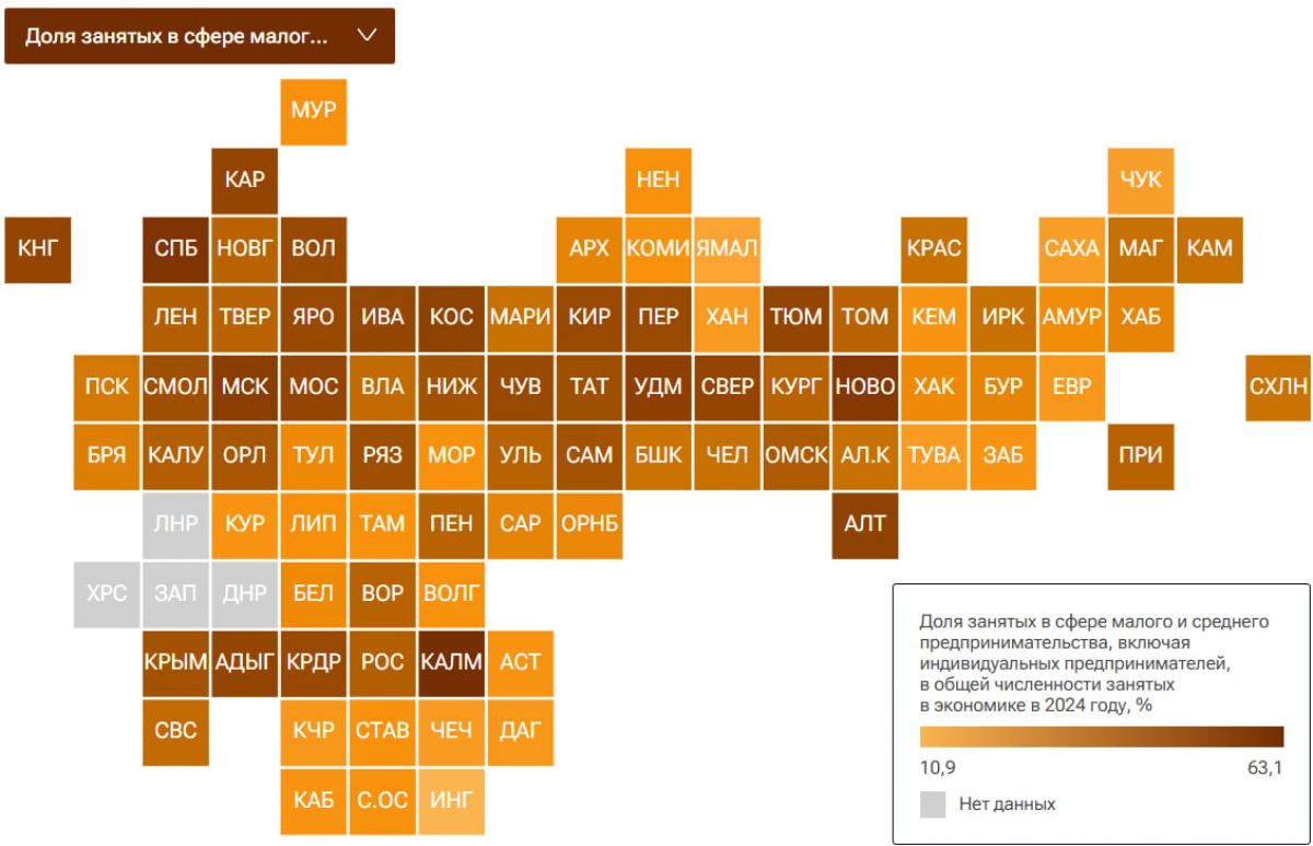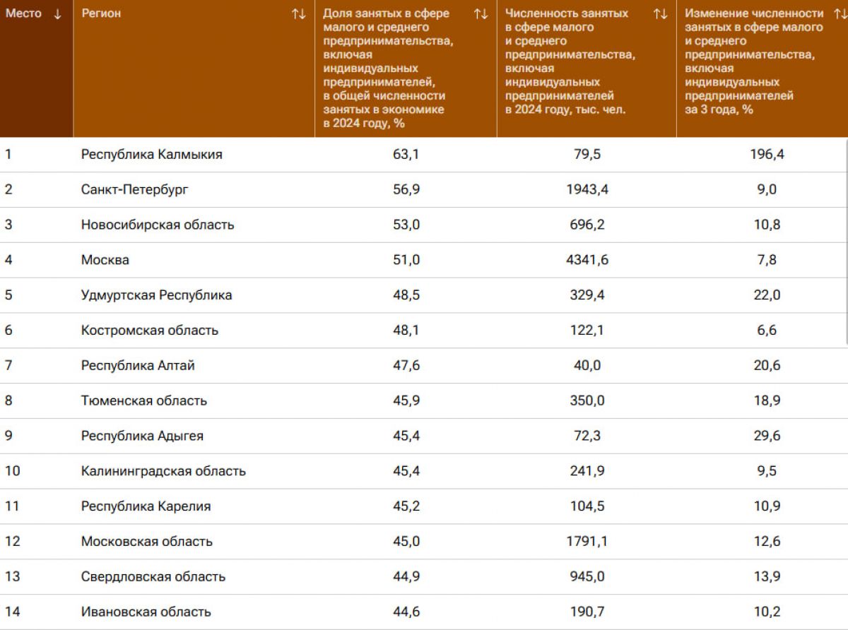 Источник основывался на информации, размещенной в Единой межведомственной информационно-статистической системе. Эксперты составили три основания для оценивания: доля населения, занятая в малом и среднем предпринимательстве (включая ИП); численность населения, занятого в МСП и динамику численности занятых в этой сфере за три года. Показатели учитывались на основе базы за 2024 год.