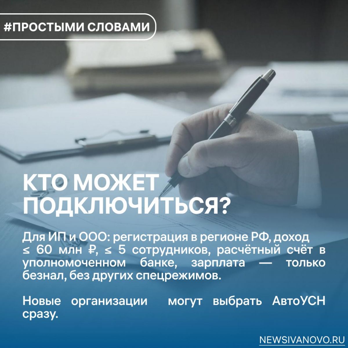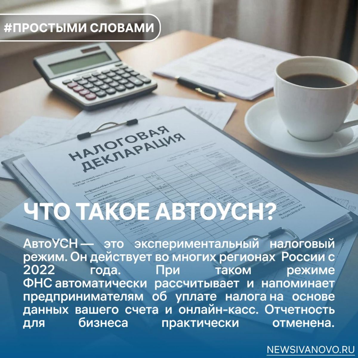 С нового года малый и средний бизнес Ивановской области сможет перейти на принципиально новый формат уплаты налогов — «АвтоУСН». Соответствующее заявление сделал губернатор Ивановской области на закрытой от независимых СМИ встрече с жителями 6 декабря. Эксперимент, инициированный федеральными властями, призван максимально упростить жизнь предпринимателям и освободить их от бумажной волокиты.