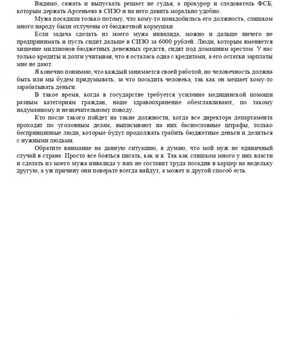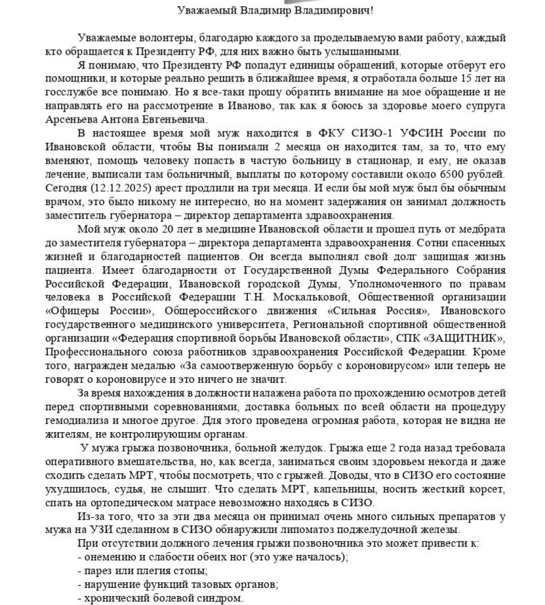 Супруга также заявляет об ухудшении состояния здоровья мужа. По ее словам, у него грыжа позвоночника и заболевание желудка, и первое требовало оперативного вмешательства еще два года назад. Она утверждает, что в условиях СИЗО невозможно провести МРТ, капельницы, носить жесткий корсет и спать на ортопедическом матрасе, а судья не учитывает доводы о состоянии здоровья. В обращении говорится, что из-за приема сильных препаратов у Арсеньева при УЗИ, сделанном в СИЗО, обнаружили патологию поджелудочной железы.