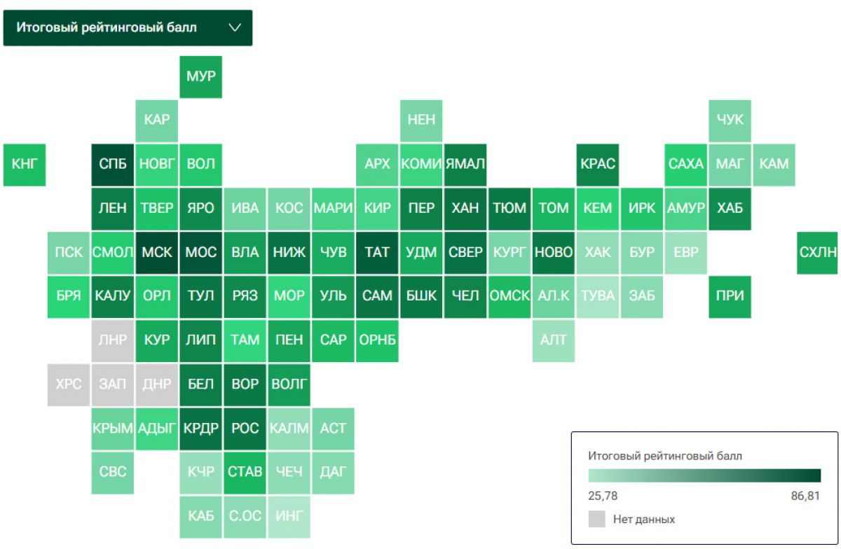 Среди лидеров традиционно Москва, Санкт-Петербург и Московская область с максимальным показателем в 86,81. Аутсайдерами стали Республика Ингушетия, Тыва, Еврейская автономная область.