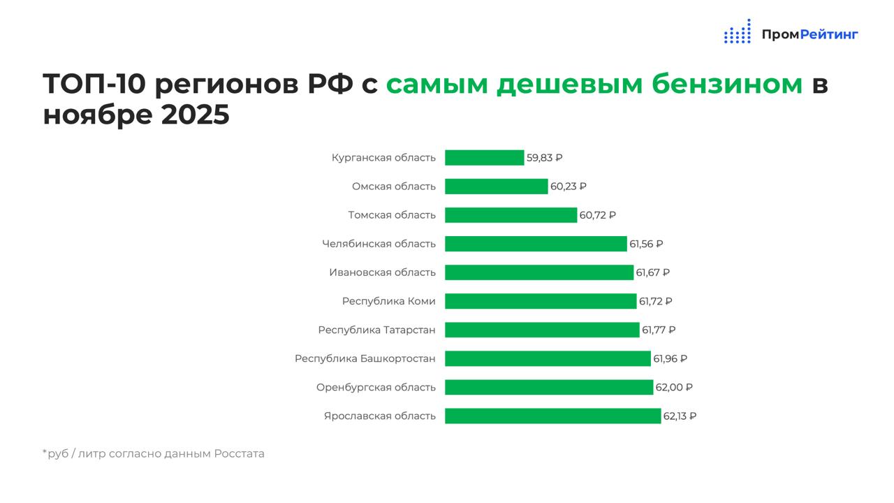 Рейтинг, составленный компанией «Промрейтинг», возглавила Курганская область. За ней следуют Омская и Томская области, занявшие второе и третье места соответственно. Средняя цена литра топлива в Ивановской области составила 61,67 рубля.