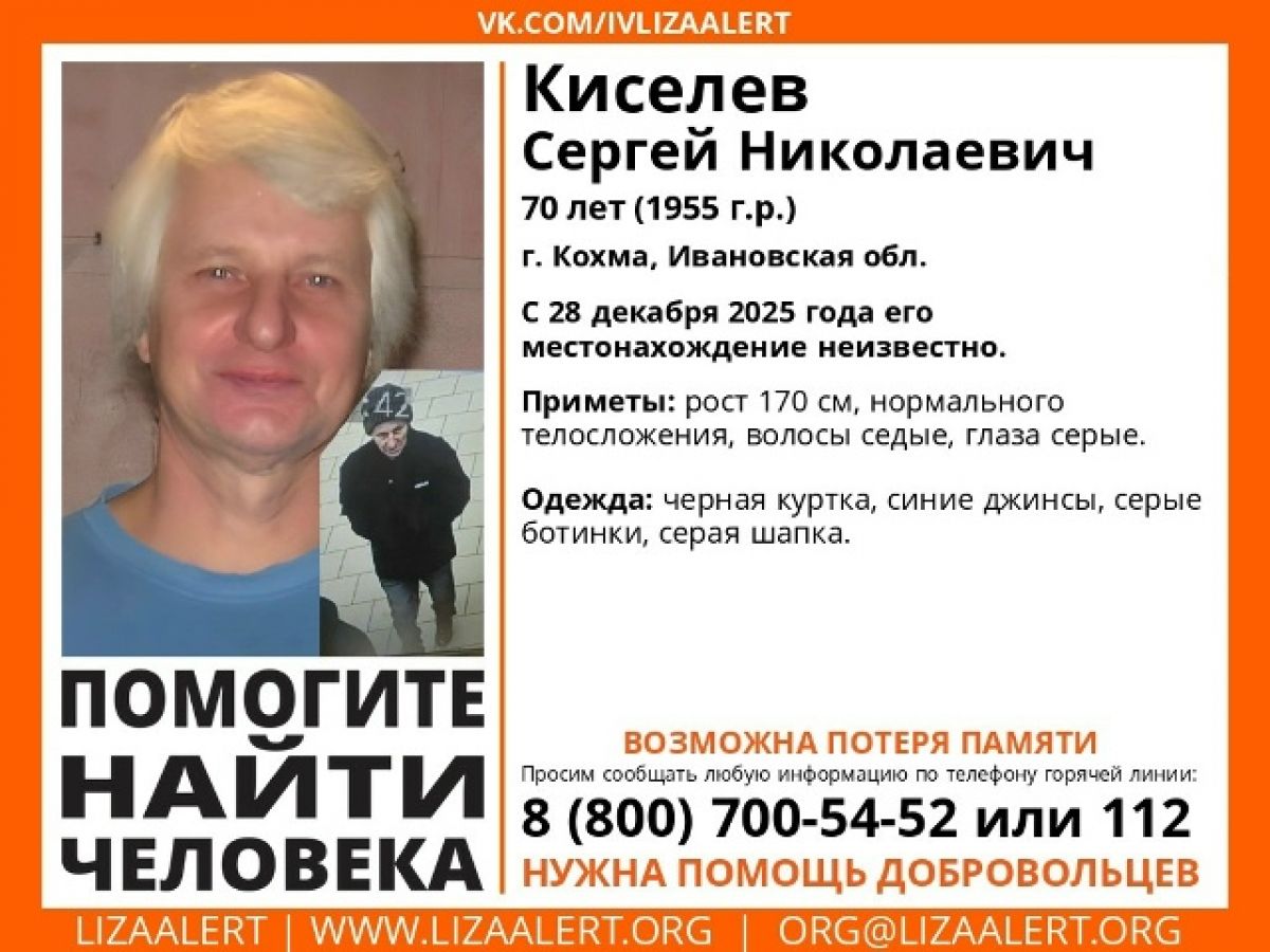 Всех неравнодушных, особенно жителей Кохмы и Иванова, просят присоединиться к поискам. Рекомендуемая экипировка — городская одежда по погоде. Любая информация о местонахождении Сергея Николаевича крайне важна. Информация о пропавшем распространена поисково-спасательным отрядом «ЛизаАлерт».