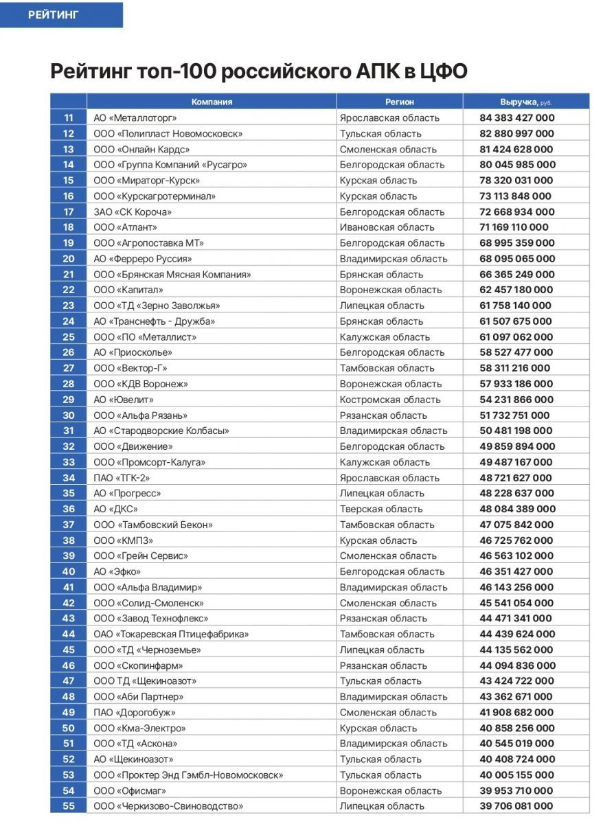 Кроме того, регион представлен в ТОП-100 компаний агропромышленного комплекса ЦФО. В этом рейтинге 18-е место заняла организация «Атлант», работающая в сфере вспомогательной деятельности, связанной с железнодорожным транспортом. Выручка компании по итогам года составила 71 млрд рублей.