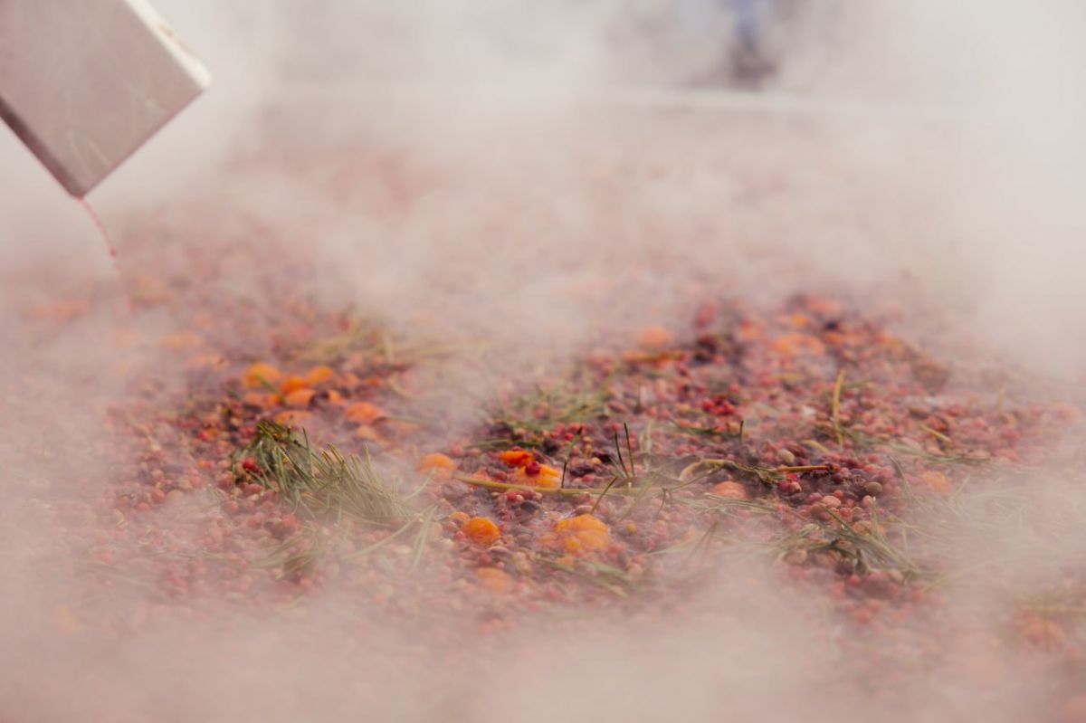 Горячий напиток готовили в большом чане. Всего получилось более 6000 порций. Рецепт сбитня был создан специально для фестиваля. В него вошли местные ягоды, мед с ивановских пасек, мандарины, пряные специи и еловая ветка.