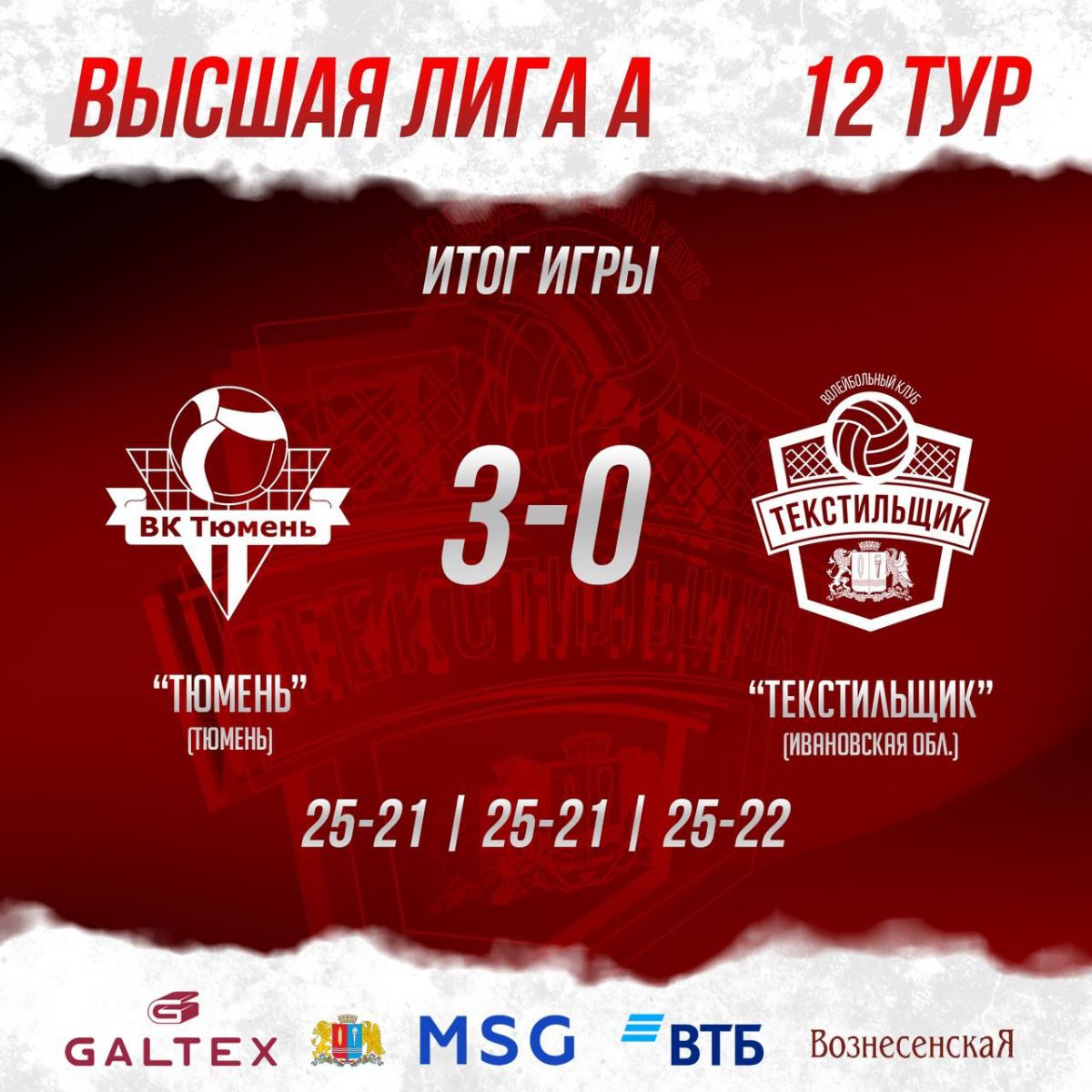 В рамках двенадцатого тура Высшей лиги «А» мужского волейбольного чемпионата России команда ВК «Текстильщик» (Ивановская область) на выезде уступила ВК «Тюмень» со счетом 0:3 (21:25, 21:25, 22:25).