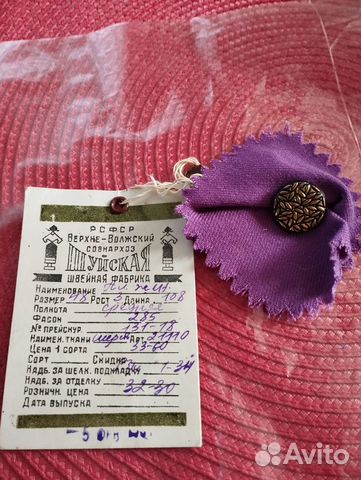 РСФСР, Верхневолжский совнархоз, производство Шуйской швейной фабрики. Также приведены параметры изделия: рост 3, длина 108, полнота – средняя, ткань – шерсть.