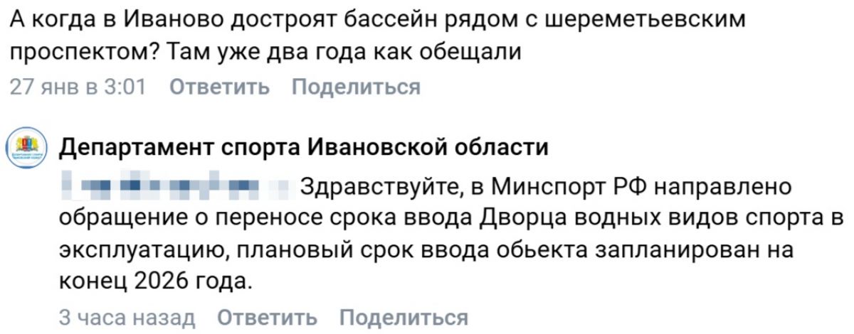 Департамент спорта Ивановской области прокомментировал вопрос о сроках достройки Дворца водных видов спорта в Иванове. Ответ был дан в комментариях к посту губернатора Станислава Воскресенского в соцсети «ВКонтакте».