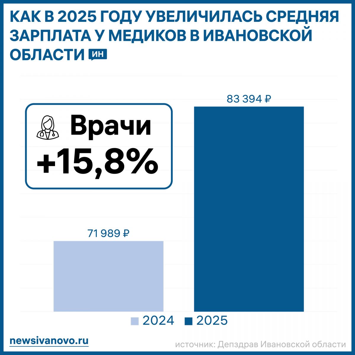 Согласно официальным данным, средняя зарплата врачей за январь-декабрь 2025 года составила 83 394,1 рубля, что на 15,8% больше, чем в 2024 году (71 989,3 рубля).