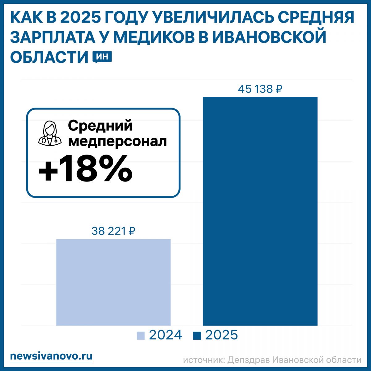 Средний медицинский и фармацевтический персонал также получил повышение: их средняя заработная плата выросла до 45 137,8 рубля (в 2024 году — 38 221 рубль). Рост составил 18%.