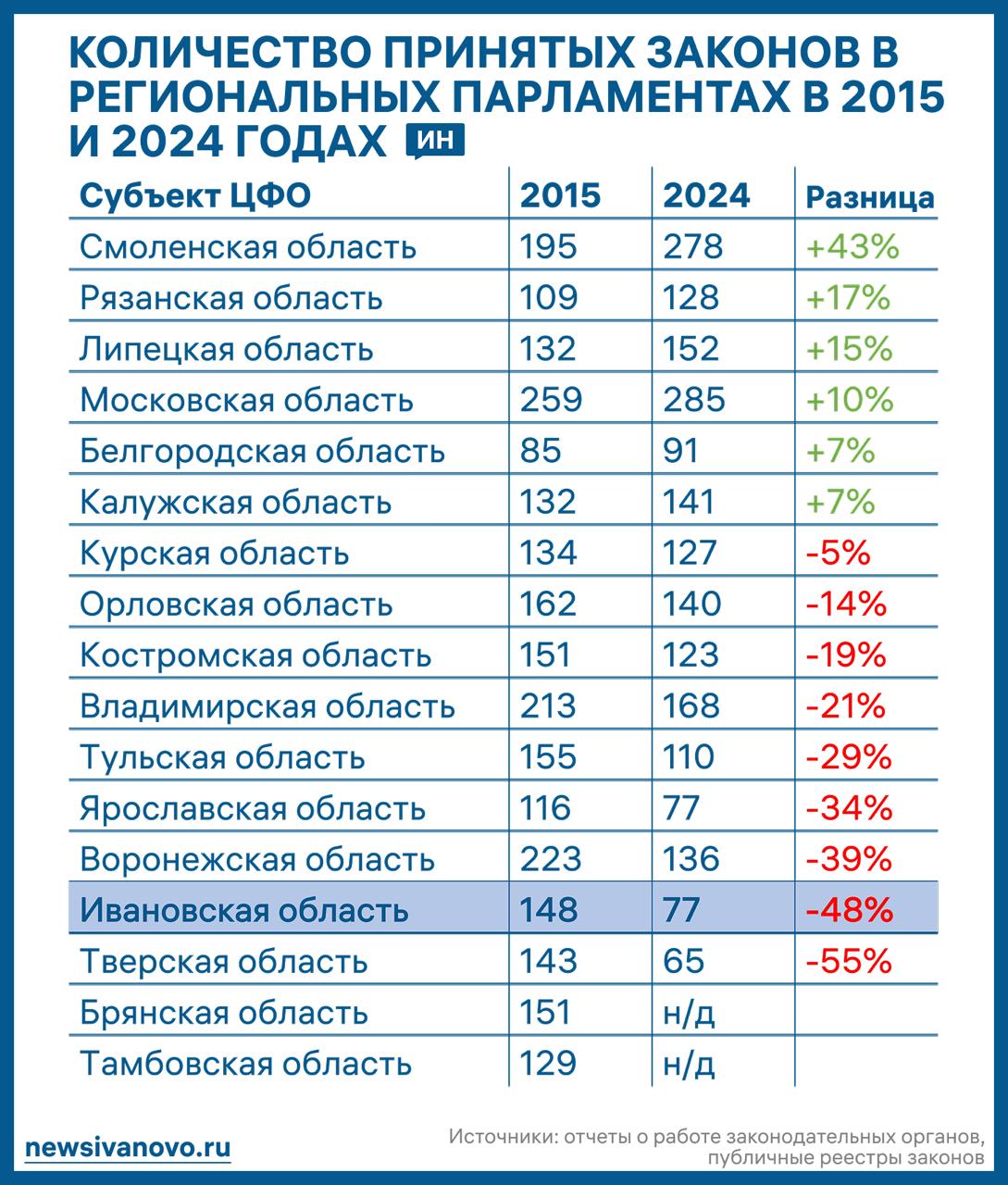 Согласно анализу данных по регионам Центрального федерального округа, Ивановская область находится практически в конце списка по количеству принятых законов. Лидерами по законодательной активности стали Смоленская, Рязанская и Липецкая области.