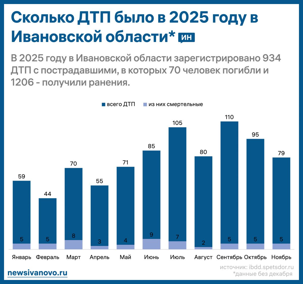 Данные по месяцам показывают, что высокий уровень аварийности в регионе фиксируется не только в зимний период. Так, в январе 2025 года в Иванове произошло 33 ДТП, во всей области – 59. Смертельными стали пять аварий на весь регион, одна из которых случилась в областном центре.