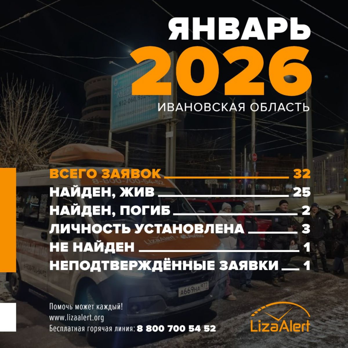 В Ивановской области за январь текущего года поступило 32 заявки на поиск пропавших людей. Об этом сообщает поисково-спасательный отряд «ЛизаАлерт».