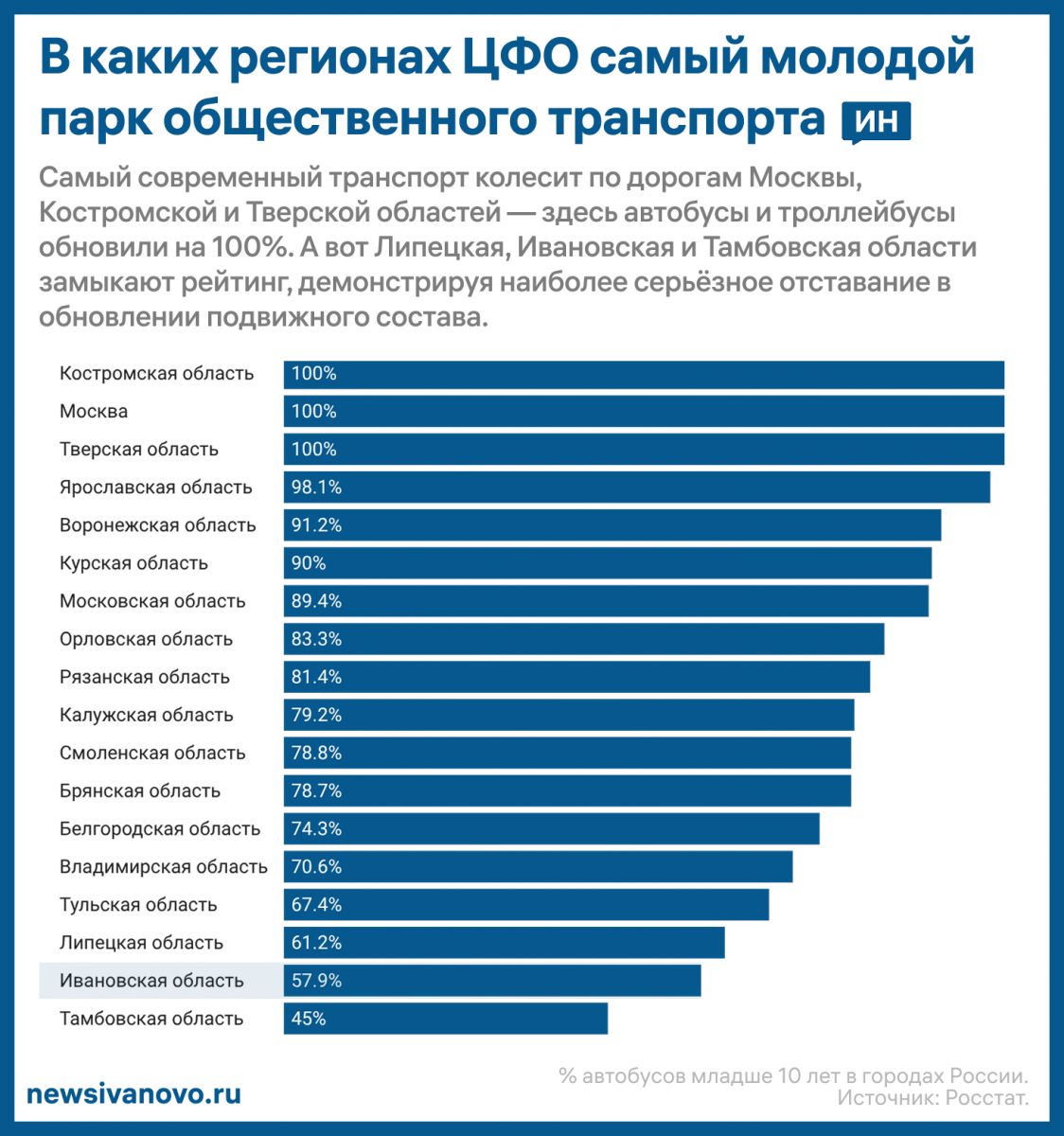 Хуже ситуация обстоит только в Тамбовской области, где доля современного транспорта составляет 45%. При этом лидерами рейтинга стали Москва, а также Тверская и Костромская области, где 100% подвижного состава соответствует возрастному критерию моложе 10 лет. Рейтинг, основанный на официальной статистике за январь, составило издание «Ивановские новости».