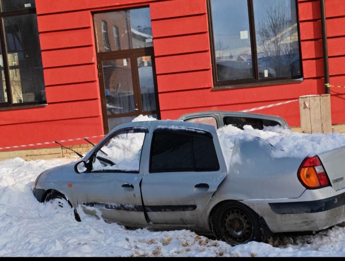 На кадрах отчётливо видно, что снег с крыши покрыл всю дорогу и стоящие рядом со зданием машины. Больше всего пострадала именно «Рено» – у неё искорежена крыша. Из простого авто она невольно превратилась в Кабриолет.