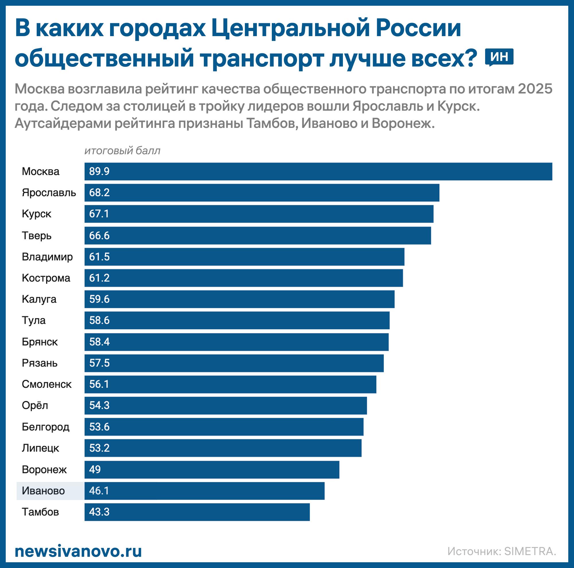 Ивановская область заняла антилидирующие позиции в рейтинге качества общественного транспорта по итогам 2025 года. Согласно исследованию компании SIMETRA, областной центр расположился на 16-м месте среди 17 городов Центрального федерального округа, опередив только Тамбовскую область. В общероссийском списке из 100 городов Иваново оказалось на 81-й строчке, потеряв за год сразу 16 позиций. Итоговый балл столицы региона составил всего 46,1 из 100 возможных.