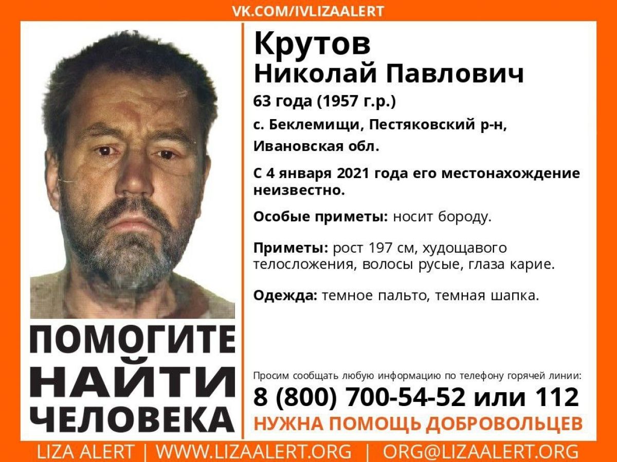 Тревога не отпускает родных Николая Крутова, 63 лет, из села Беклемищи Пестяковского района. Мужчина пропал морозным январским вечером, выйдя от знакомого и направившись в сторону своего дома. Больше его никто не видел, а поступавшие свидетельства не дали результата.