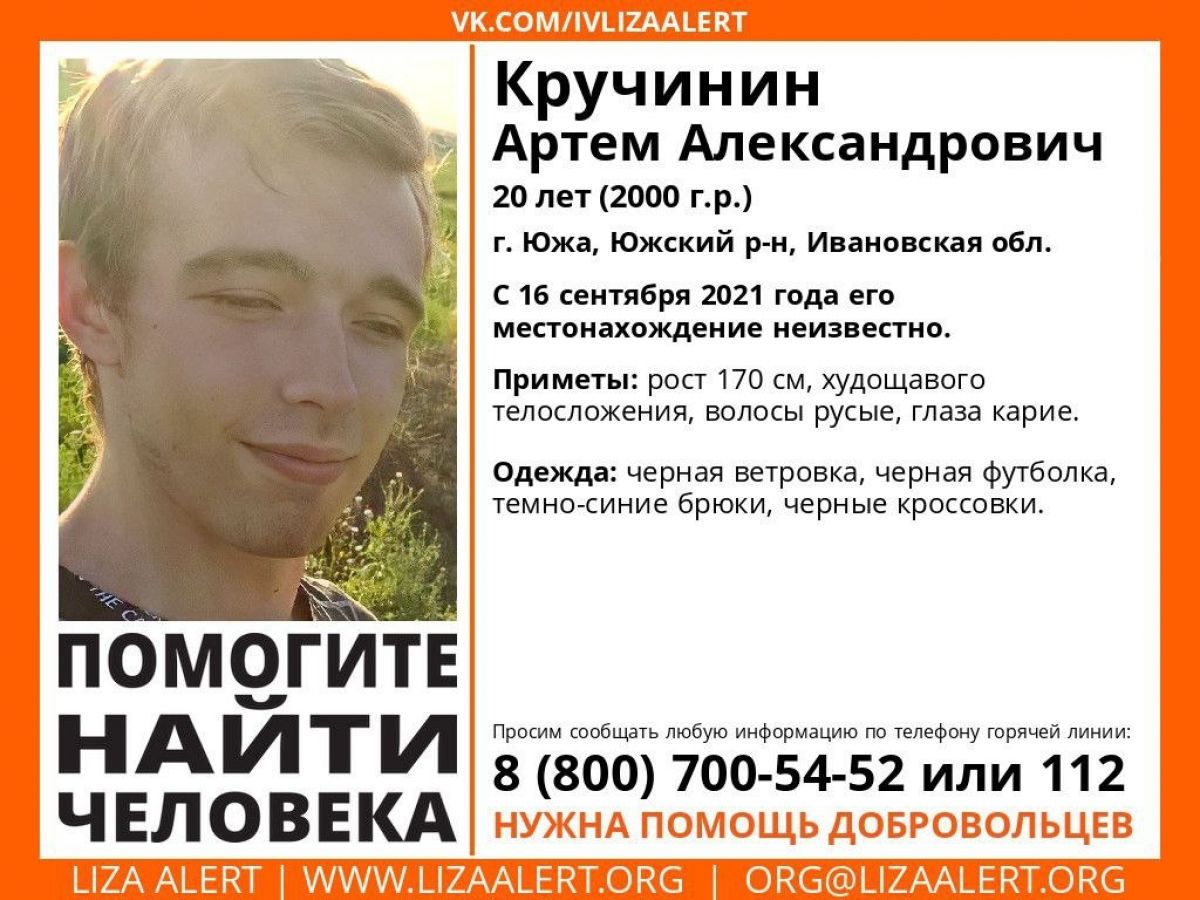 До сих пор не найден и 20-летний Артем Кручинин из города Южа. Молодой человек пропал 16 сентября 2021 года. Он ушел от своего знакомого, и с тех пор о его судьбе ничего не известно. Несколько свидетельств, поступивших ранее, к сожалению, не помогли прояснить ситуацию.