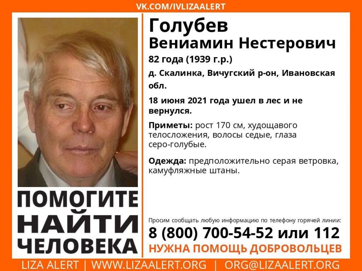 Уже почти пять лет не могут найти и 82-летнего Вениамина Голубева из деревни Скалинка Вичугского района. Пенсионер отправился за грибами в свой любимый лес 18 июня 2021 года. К вечеру он понял, что заблудился, и позвонил спасателям. Специалисты «Лес на связи» оперативно запросили помощь, и поисковые группы приступили к работе уже в три часа ночи 19 июня. Поиски не прекращались неделю, а попытки найти дедушку предпринимались вплоть до наступления зимы и даже спустя год, но, увы, безуспешно.