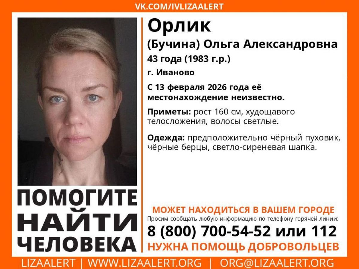 В поисково-спасательном отряде «ЛизаАлерт» просят всех, кто располагает информацией о местонахождении 43-летней Ольги Орлик, сообщить об этом на горячую линию 8 (800) 700-54-52 или по номеру 112.