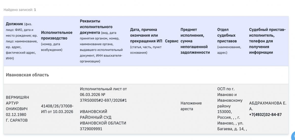 Согласно информации из картотеки суда, дело поступило 27 февраля этого года. В качестве ответчика указан Артур Вермишян, третьими лицами проходят мэрия Ивановского муниципального округа, территориальное управление соцзащиты населения по Кохме и Ивановскому району, а также Марина Вермишян. Судебное заседание назначено на 23 марта.