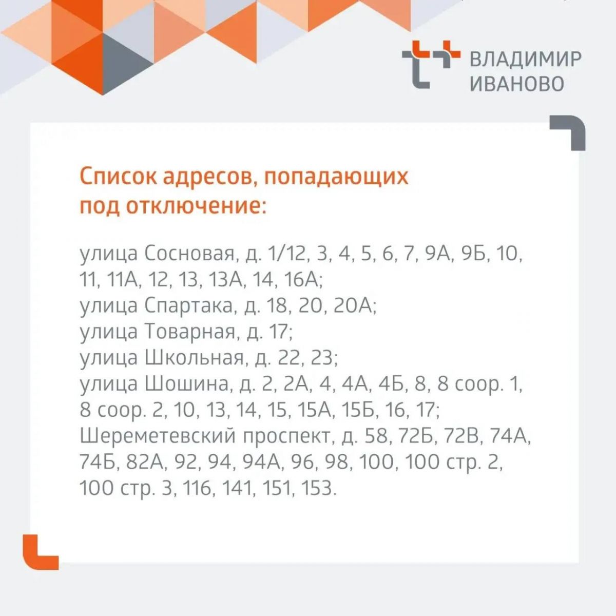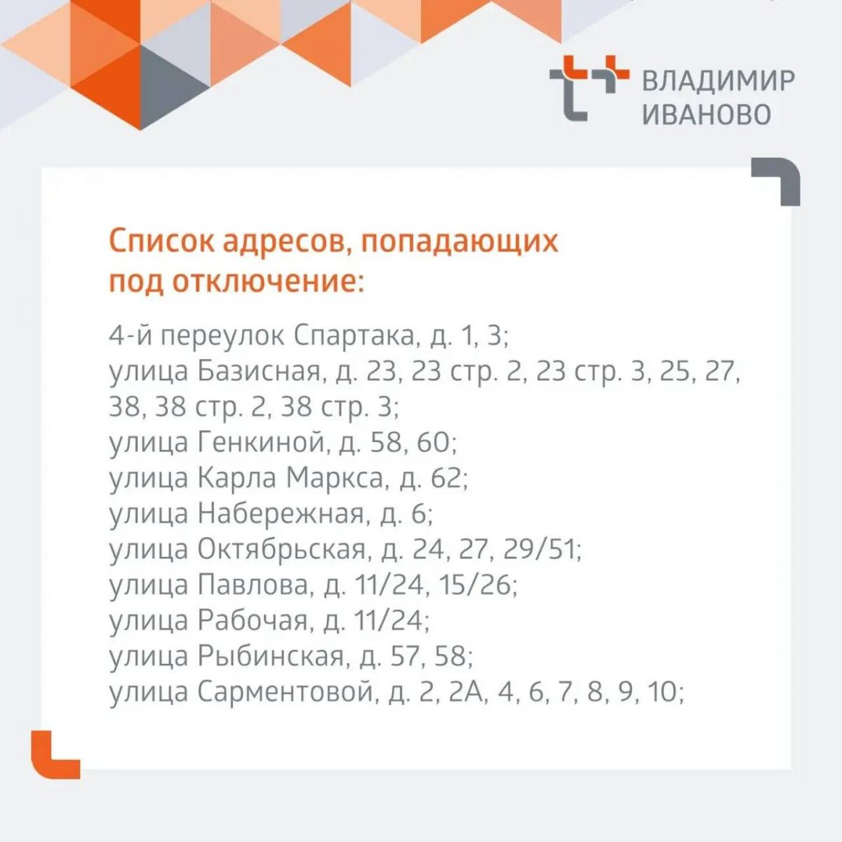 Список адресов, попадающих под отключение: