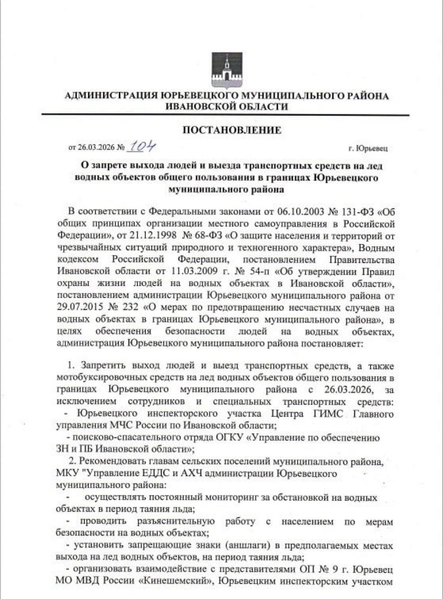 В районе Ивановской области запретили выходить и выезжать на лед. Соответствующее постановление подписала администрация Юрьевецкого района сегодня, 26 марта, передаёт пресс-служба МЧС 37-го региона.