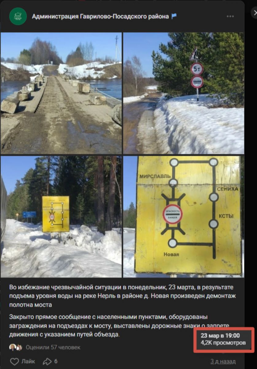 Ранее объявлялось о демонтаже моста, якобы прошедшем 23 марта, во избежание чрезвычайных ситуаций. В единую картину история складывается с натяжкой – то ли переправу недоразобрали, то ли затопило остатки от нее.