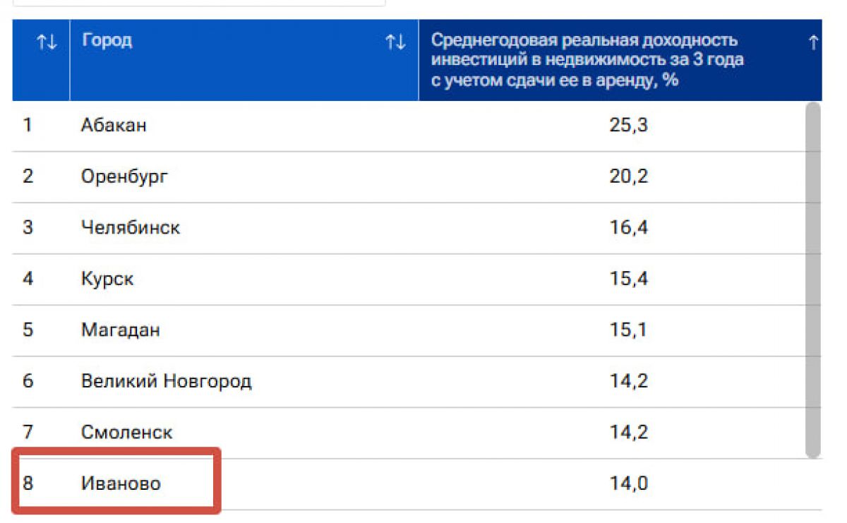 Иваново заняло 8-е место в рейтинге российских городов по доходности вложений в недвижимость. По данным исследования Центра экономических исследований «РИА Рейтинг», среднегодовая реальная доходность инвестиций за последние три года составила здесь 14%.