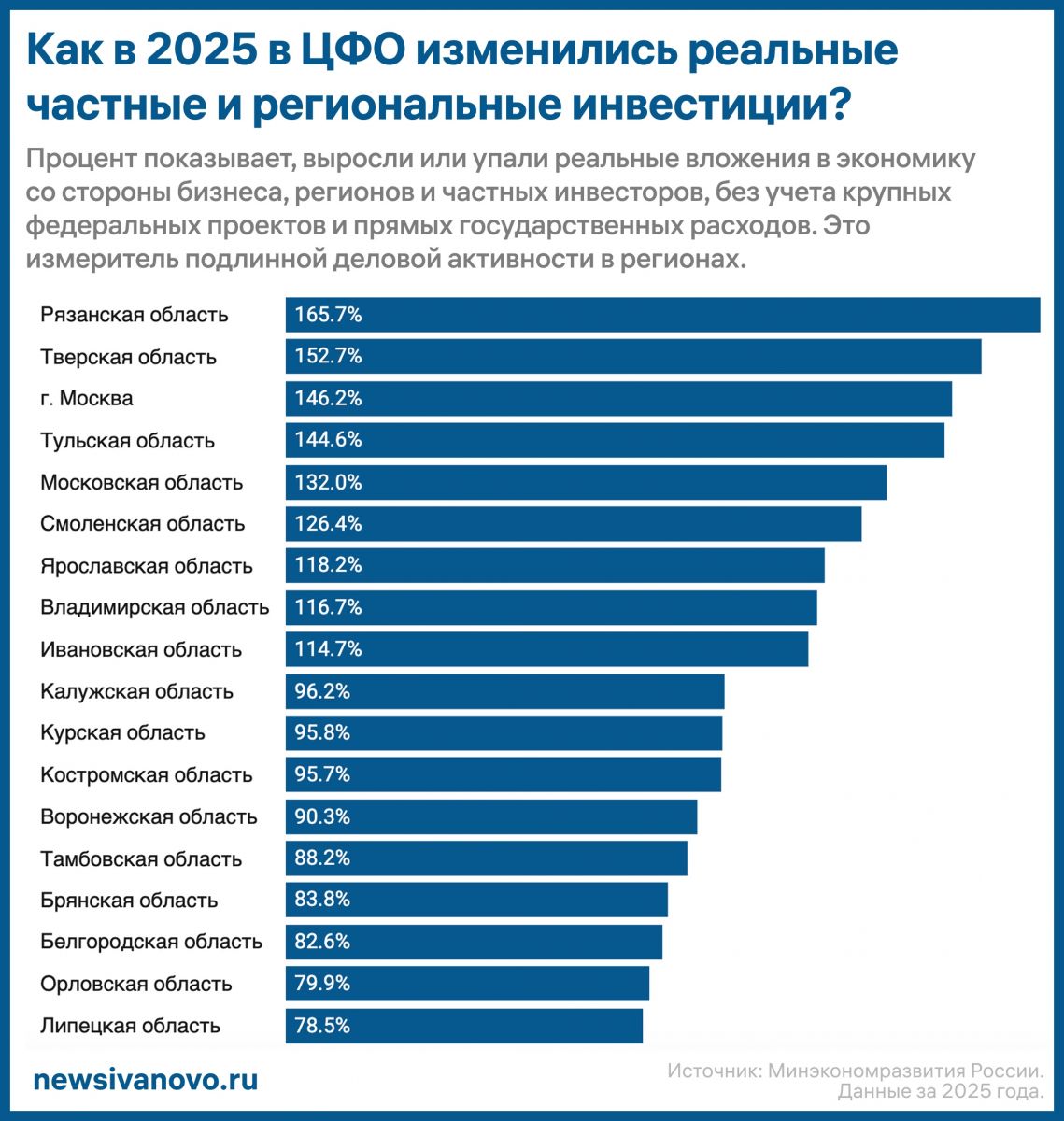 По итогам 2025 года темп роста физического объема инвестиций в основной капитал (за исключением вложений инфраструктурных монополий в рамках федеральных проектов и бюджетных ассигнований РФ) составил в Ивановской области 14,7 процентного пункта (п. п.). Соответствующий рейтинг опубликовало Минэкономразвития России.