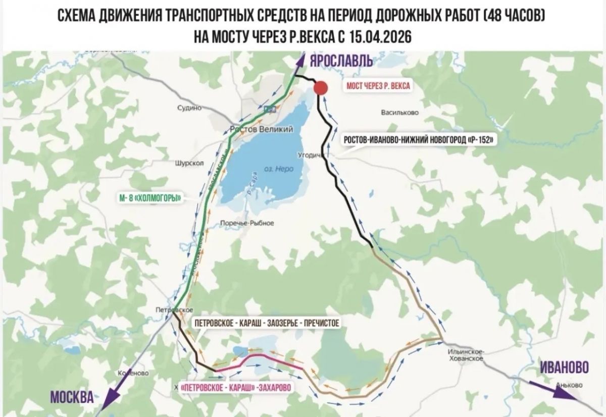 В соседней Ярославской области вводятся временные ограничения на движение по мосту через реку Вёкса в Ростовском округе. С 6 утра 15 апреля до 6 утра 17 апреля проезд для машин, например, из Ивановской области закроют — специалистам нужно 48 часов, чтобы отремонтировать опоры мостового сооружения. Об этом сообщает дептранс 37-го региона.