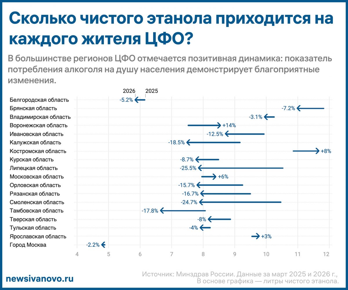 Жители Ивановской области демонстрируют позитивную динамику в отношении потребления спиртного. По данным Минздрава, в марте 2026 года на душу населения пришлось 8,71 литра чистого этанола. Для сравнения: за аналогичный период прошлого года этот показатель был значительно выше и составлял 9,95 литра.