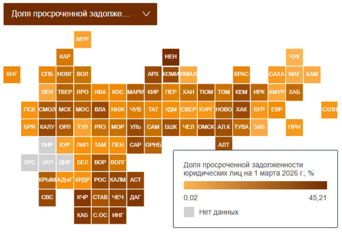 Аутсайдерами оказались Ненецкий автономный округ, Дагестан и Кабардино-Балкария. Здесь доля просроченных долгов юридических лиц варьируется от 29% до 45%.