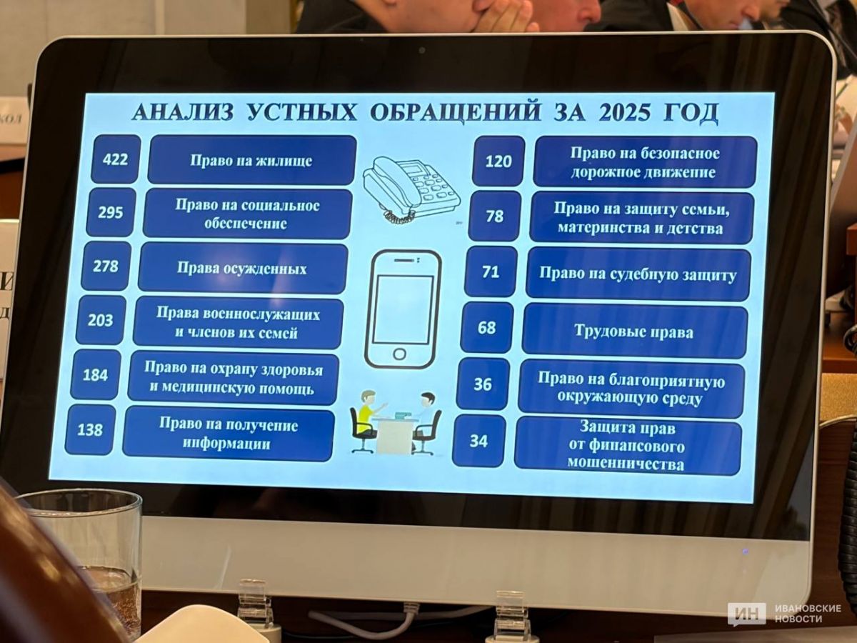 По данным доклада УПЧ 37-го региона Светланы Шмелевой, представленного депутатам на пленарном заседании областной думы, среди письменных обращений на первом месте оказались социальные права – 233 обращения. В эту группу вошли вопросы жилья, пенсионного и социального обеспечения, а также охраны здоровья и медицинской помощи.